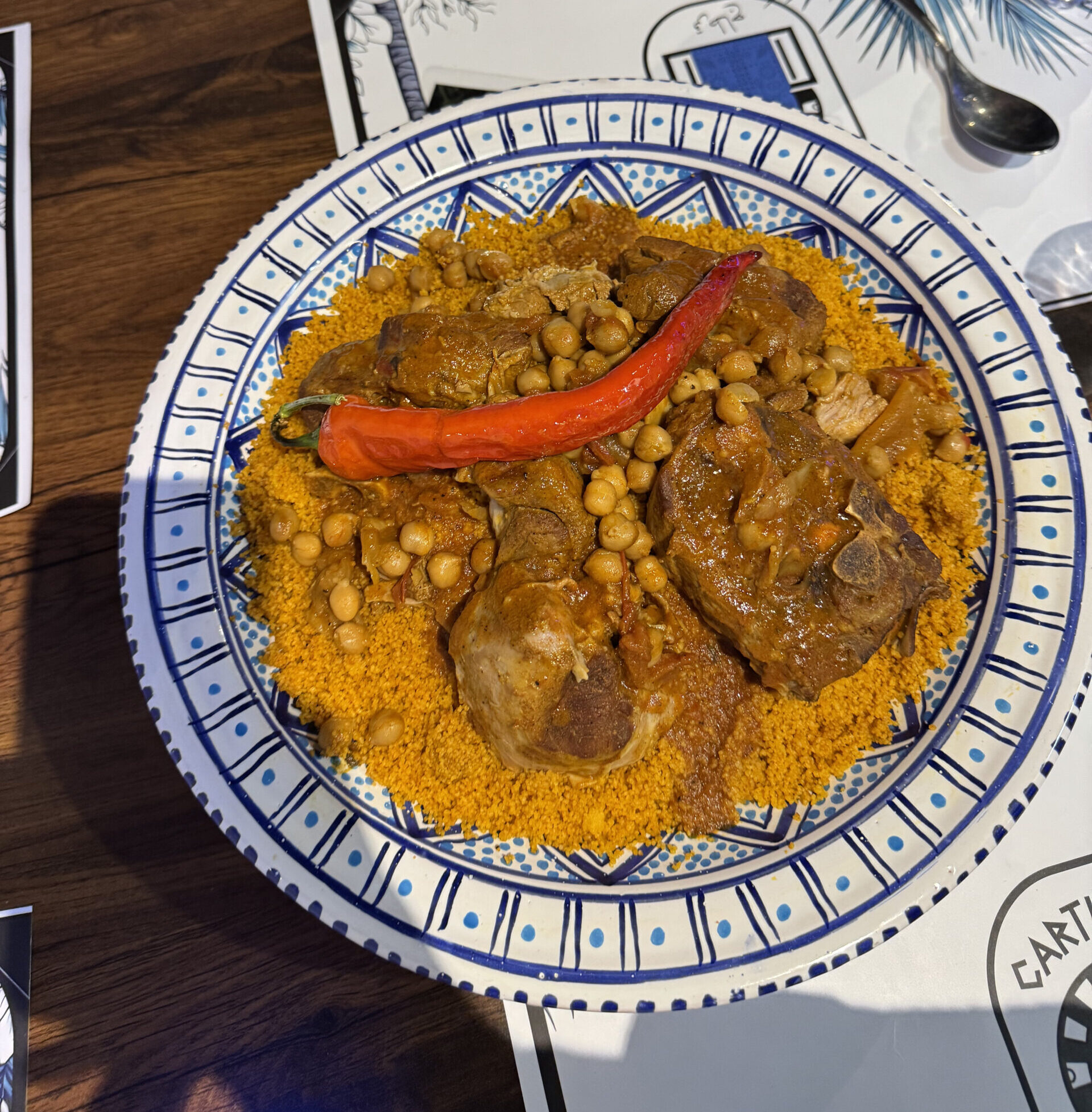 Ein echtes tunesisches Gericht: Feiner, gedämpfter Couscous, serviert mit zartem Lammfleisch, das langsam in einer reichhaltigen, gewürzten Sauce geschmort wird. Dazu kommen frisches Gemüse wie Karotten, Zucchini, Kichererbsen und Steckrüben, die das Gericht abrunden. Couscous bel Lham ist ein fester Bestandteil tunesischer Familienfeiern und bringt die Aromen Nordafrikas direkt auf den Tisch.