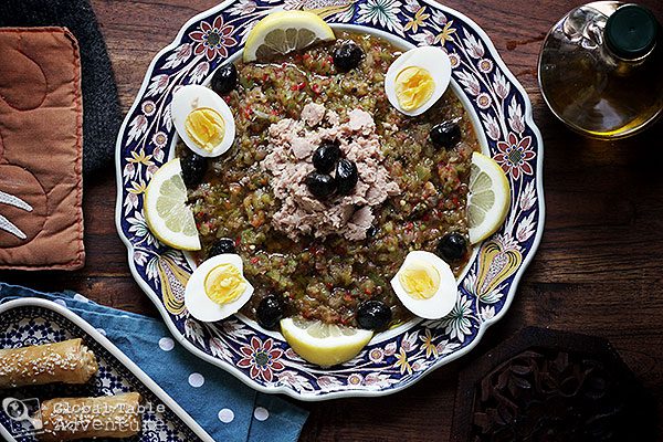 Geniessen Sie Salade Tounsia – frisches Gemüse, Thunfisch, Oliven und Eier, voll tunesischer Aromen.