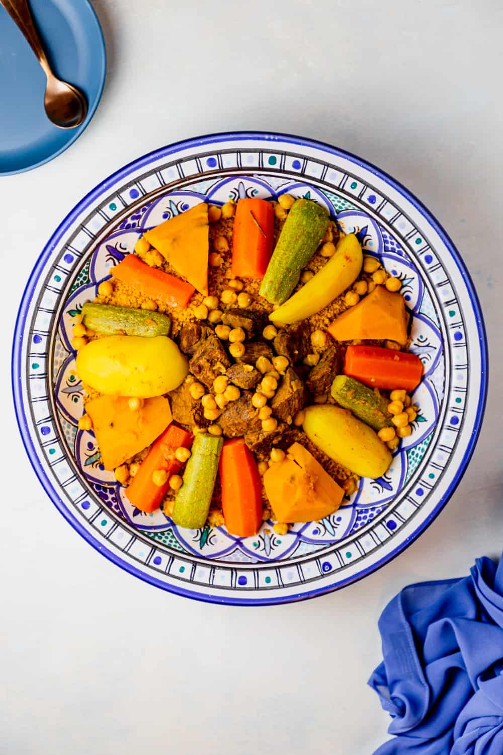 Traditionelles Couscous bel Lahm mit zartem Lamm, geschmortem Gemüse und Kichererbsen – ein echter Genuss.